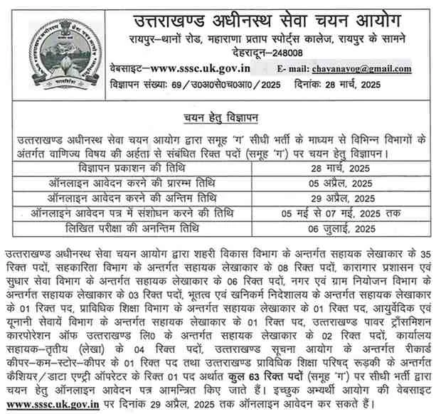 रिपोर्ट:लक्ष्मण बिष्ट 👹👹 : उत्तराखंड अधीनस्थ सेवा चयन आयोग ने समूह ग के 63 रिक्त पदों पर निकाली सीधी भर्ती