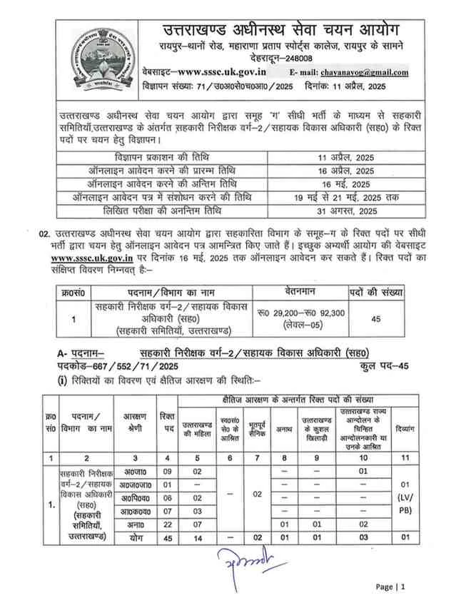 रिपोर्ट:लक्ष्मण बिष्ट 👹👹 : उत्तराखंड अधीनस्थ सेवा चयन आयोग ने सहकारिता विभाग में समूह ग के 45 पदों पर निकाली सीधी भर्ती ।