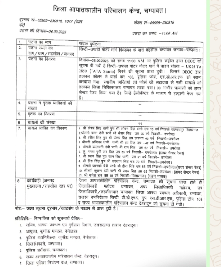 रिपोर्ट: लक्ष्मण बिष्ट : चंपावत:सिप्टी छतकोट मोटर मार्ग में वाहन दुर्घनाग्रस्त, 11 लोग घायल