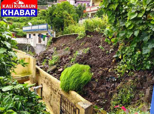 रिपोर्ट:लक्ष्मण बिष्ट : लोहाघाट :सैरीगैर(कलीगांव) में दीवार ढहने से खतरे की जद में आए भवन बाल -बाल बचे राहगीर।