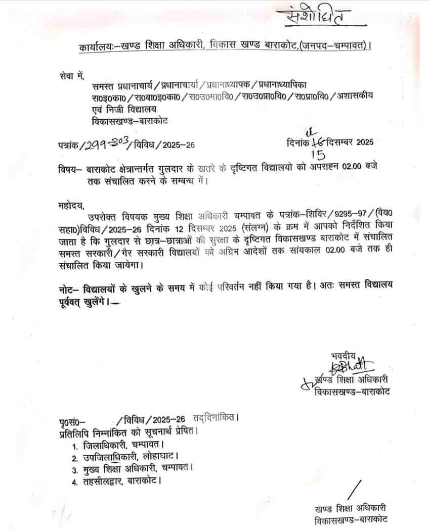 बाराकोट ब्लॉक में गुलदार के खतरे को देखते हुए अब विद्यालयों को अपराह्न 2:00 बजे तक ही संचालित किया जाएगा इस बात के आदेश खंड शिक्षा अधिकारी बाराकोट के द्वारा जारी कर दिए गए हैं। विद्यालय के खुलने के समय में कोई परिवर्तन नहीं किया गया है। एसडीएम लोहाघाट नीतू डांगर के द्वारा 9 दिसंबर की घटना के बाद डीएम चंपावत मनीष कुमार को अवगत कराया गया था कि बाराकोट क्षेत्र में पिछले कुछ दिनों से विभिन्न स्थानों पर गुलदार देखे जाने की घटनाएं निरंतर प्राप्त हो रही है इससे विद्यालय में अध्यनरत छात्र-छात्राओं की सुरक्षा पर प्रतिकूल प्रभाव पड़ने की पूर्ण संभावना है। विद्यालय के 3:00 बजे छुटने के समय अधिकांश बच्चे पैदल दूरी तय कर आवागमन करते हैं जिससे किसी भी अप्रिय घटना की आशंका बढ़ जाती है ।छात्र-छात्राओं की सुरक्षा को देखते हुए शीतकाल में विद्यालयों की समय अवधि को कम किया जाना उचित प्रतीत होता है ताकि बच्चे सुरक्षित अपने घर पहुंच सके।
