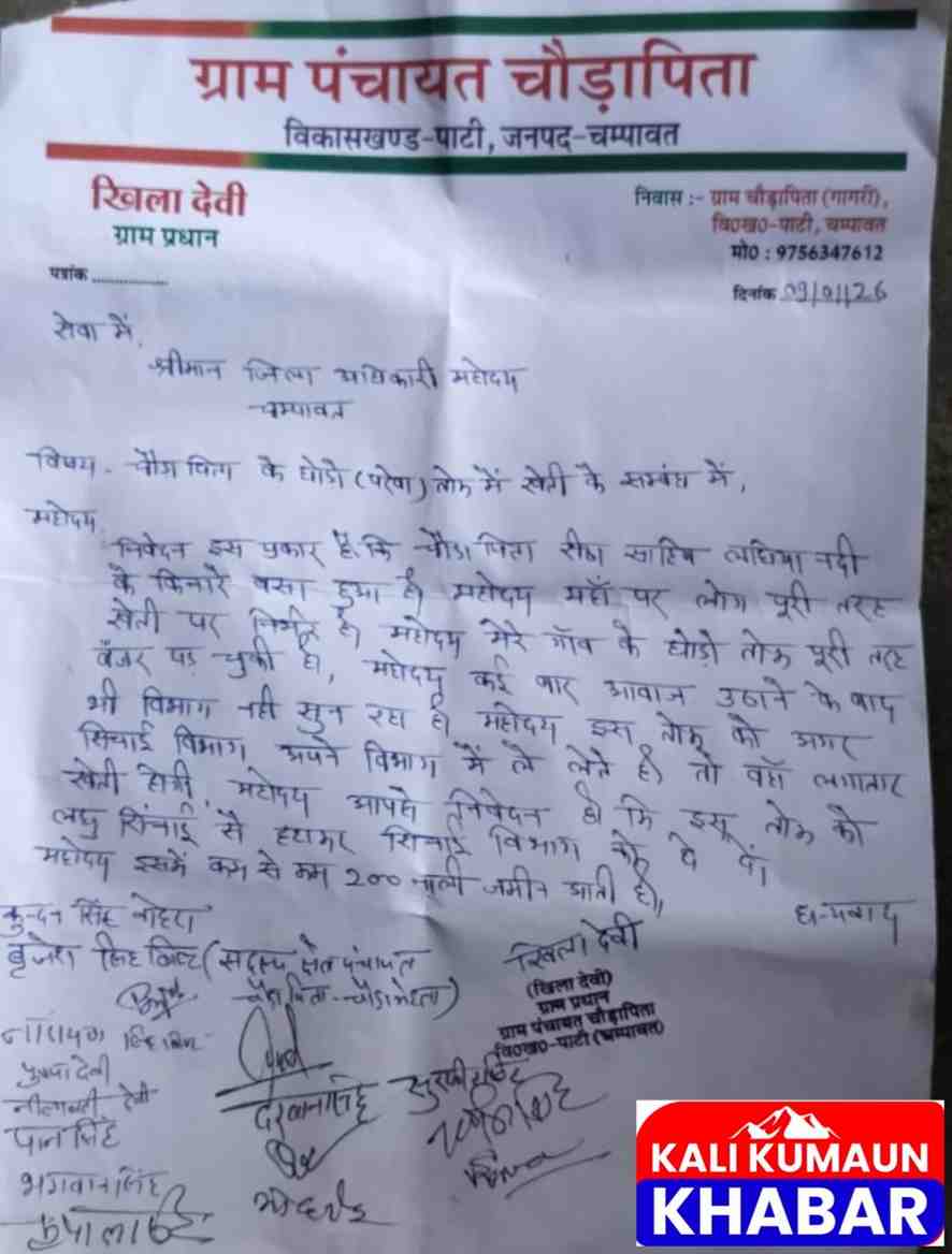 चंपावत जिले के लधीया घाटी क्षेत्र की ग्राम सभा चौड़ा पिता का घोड़ोंतोक जो धान, गेहूं ,मड़वा ,गहत व अन्य फसलों के लिए प्रसिद्ध है। आज वहां के खेत विभागीय उदासीनता के चलते सिंचाई व्यवस्था न होने के कारण बंजर व वीरान पड़ चुके है। ग्राम प्रधान खिलादेवी, प्रतिनिधि कुंदन सिंह बोरा ,क्षेत्र पंचायत सदस्य बृजेश बिष्ट व ग्रामीणों ने बताया ग्रामीणों की खेतों की सिंचाई व्यवस्था के लिए लघु सिंचाई विभाग के द्वारा सिंचाई गूल का निर्माण कराया गया था ।जो आपदा में पूरी तरह क्षतिग्रस्त हो गई थी। कुंदन बोरा ने बताया कई बार लघु सिंचाई विभाग के अधिकारियों से क्षतिग्रस्त गूल की मरम्मत की मांग की गई थी। पर उनकी समस्या के समाधान के लिए लघु सिंचाई विभाग के द्वारा कोई संज्ञान नहीं लिया गया। बोरा ने कहा खेतों में सिंचाई व्यवस्था न होने के कारण मजबूरी में ग्रामीणों ने खेती करना छोड़ दिया। जिस कारण बड़ी तादात में ग्रामीणों के खेत बंजर पड़ चुके है।