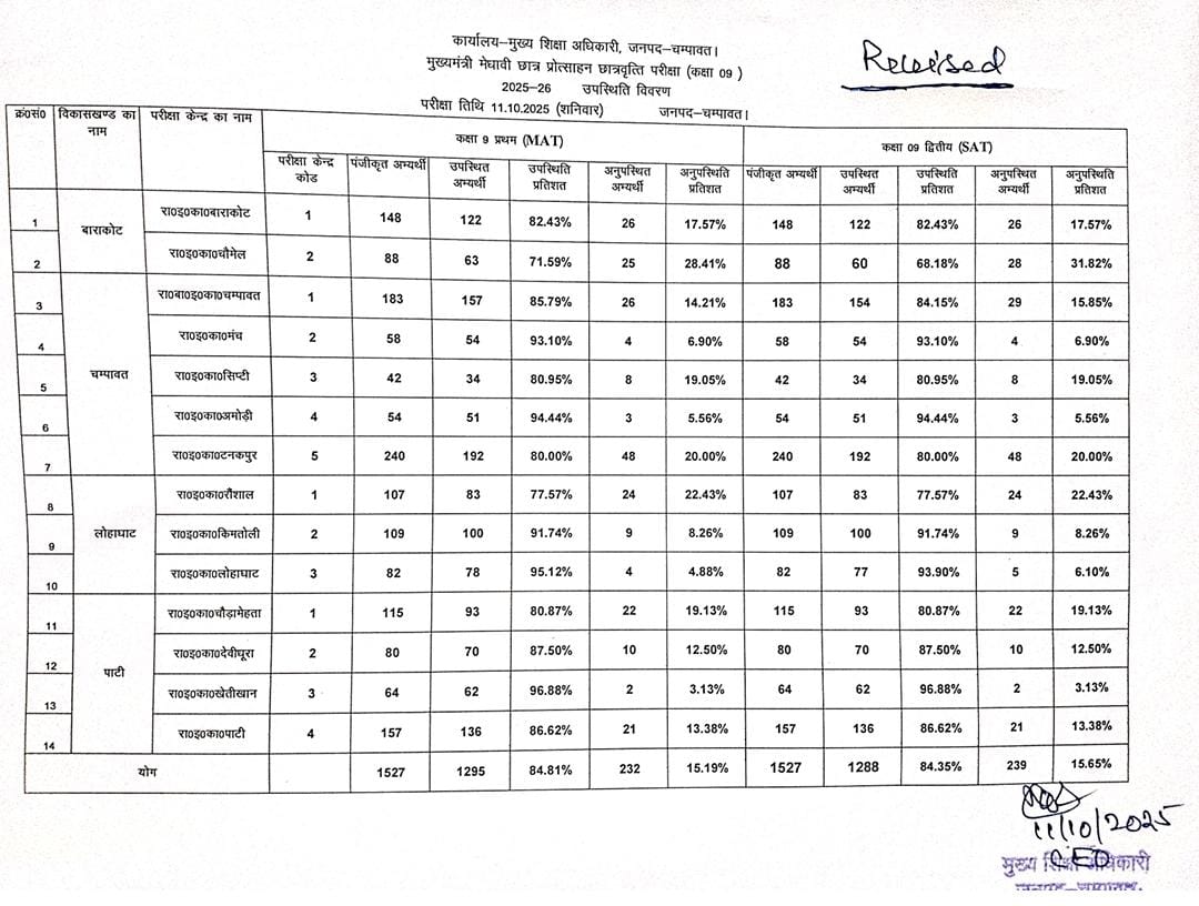 मुख्यमंत्री मेधावी छात्र प्रोत्साहन छात्रवृत्ति परीक्षा (कक्षा 9 और 6) शनिवार को जनपद चम्पावत के सभी परीक्षा केंद्रों पर शांतिपूर्ण एवं सुव्यवस्थित ढंग से सम्पन्न हुई। परीक्षा के सफल, निष्पक्ष एवं पारदर्शी संचालन हेतु प्रशासन द्वारा पूर्व से ही समुचित व्यवस्थाएँ सुनिश्चित की गई थीं।