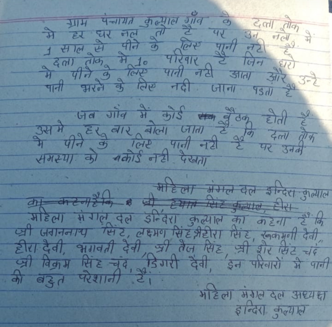 महिला मंगल दल की इंदिरा कुल्याल का कहना है कि गांव के जगन्नाथ सिंह, लक्ष्मण सिंह, हीरा सिंह ,रुक्मिणी देवी ,हीरा देवी ,भगवती देवी, तेज सिंह, शेर सिंह ,विक्रम सिंह, डिगरी देवी के परिवारों को पेयजल की किल्लत वर्ष भर बनी रहती है। जिस कारण वह काफी परेशान है पर मामले में संबंधित विभाग कोई भी संज्ञान नहीं ले रहा है। ग्रामीणों ने मामले को जिलाधिकारी चंपावत मनीष कुमार के सामने रखने की बात कही है कहा अगर उनकी बात नहीं सुनी गई तो वह जिलाधिकारी कार्यालय में धरना देंगे। लोगों ने शासन प्रशासन से उनकी पेयजल की समस्या का समाधान करने की मांग की है। मामले का जिलाधिकारी चंपावत मनीष कुमार ने संज्ञान लिया है। जिलाधिकारी ने कहा जल्द ग्रामीणों की समस्या का प्रमुखता से समाधान किया जाएगा।