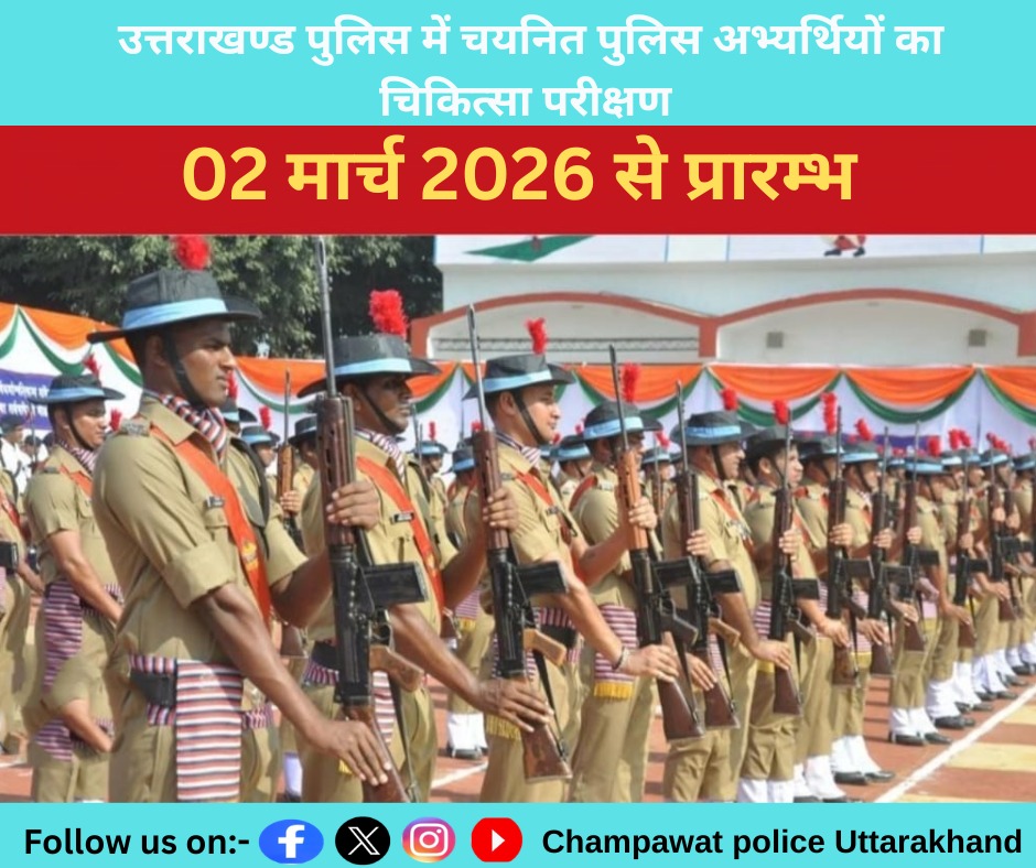 जनपद चम्पावत से पुलिस आरक्षी भर्ती परीक्षा में चयनित अभ्यर्थीयो का दिनांक 02 मार्च 2026 से प्रातः 07:30 बजे पुलिस लाइन, चम्पावत में चिकित्सा स्वास्थ्य परीक्षण किया जाएगा जिसमें अभ्यर्थी का उपस्थित होना अनिवार्य है।उत्तराखण्ड अधीनस्थ सेवा चयन आयोग द्वारा विज्ञापन संख्या 65/उ.आ.से.च.आ./2024 दिनांक 30 अक्टूबर 2024 के माध्यम से उत्तराखण्ड पुलिस विभाग में आरक्षी जनपदीय पुलिस (पुरुष) तथा आरक्षी पीएसी/आईआरबी (पुरुष) के कुल 2000 रिक्त पदों पर सीधी भर्ती हेतु प्रकाशित विज्ञापन के सापेक्ष चयन परिणाम घोषित कर दिया गया है।आयोग की विज्ञप्ति/चयन परिणाम संख्या 284/परीक्षा/2025-26 दिनांक 27-02-2026 के अनुसार पात्र अभ्यर्थियों का चयन परिणाम जारी किया गया है। विज्ञप्ति एवं प्रासंगिक सेवा नियमावलियों में उल्लिखित प्रावधानों के अनुरूप चयनित अभ्यर्थियों का चिकित्सा/स्वास्थ्य परीक्षण दिनांक 02 मार्च 2026 से संबंधित जनपदों में, जहां से अभ्यर्थियों ने शारीरिक दक्षता परीक्षा में प्रतिभाग किया था, संबंधित वरिष्ठ पुलिस अधीक्षक के पर्यवेक्षण में जनपदीय चिकित्सा बोर्ड द्वारा संपादित कराया जाएगा।जनपद चम्पावत से चयनित अभ्यर्थी दिनांक 02 मार्च 2026 को प्रातः 07:30 बजे पुलिस लाइन, चम्पावत में चिकित्सा स्वास्थ्य परीक्षण हेतु अनिवार्य रूप से उपस्थित होना सुनिश्चित करें। निर्धारित तिथि एवं समय पर उपस्थित न होने की स्थिति में अभ्यर्थी स्वयं उत्तरदायी होंगे।