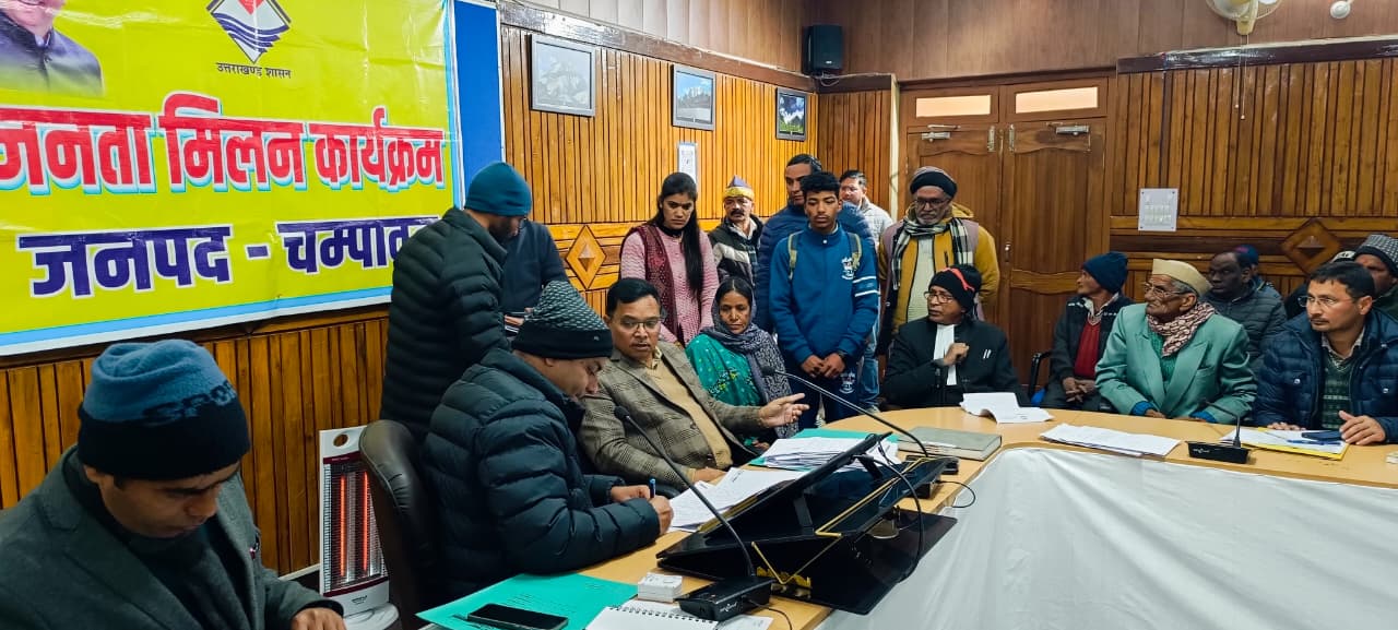 सोमवार को जिला सभागार, चम्पावत में जिलाधिकारी मनीष कुमार की अध्यक्षता में आयोजित जनता मिलन कार्यक्रम में जनपद के विभिन्न क्षेत्रों से आए नागरिकों ने अपनी समस्याएँ एवं शिकायतें प्रस्तुत कीं। कार्यक्रम के दौरान कुल 140 शिकायतें प्राप्त हुईं, जिनमें आर्थिक सहायता, आवास, पेयजल, सोलर लाइट, आपदा से क्षतिग्रस्त योजनाएँ, फसल सुरक्षा हेतु तारबाड़, रोजगार, सड़क, विद्युत, सामाजिक सुरक्षा पेंशन सहित अन्य जनहित से जुड़े विषय शामिल रहे।
