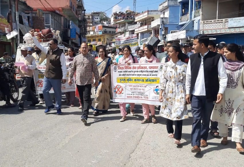 जिसमें चम्पावत और लोहाघाट के समस्त पी.एल.वी./अधिकार मित्र, प्रो-बोनो पीएलवी, अधिवक्ता, स्वयंसेवी संगठन, विद्यालयों के छात्र-छात्राएं एवं स्थानीय नागरिकों ने बढ़-चढ़कर भाग लिया।रैली का शुभारंभ प्रातः 11:30 बजे चम्पावत मुख्य बाजार क्षेत्र से हुआ। प्रतिभागियों ने “नशा मुक्त समाज – सुरक्षित भविष्य” और “ड्रग्स से मुक्ति – नई पीढ़ी की सुरक्षा” जैसे नारों के माध्यम से लोगों को नशे के दुष्प्रभावों से दूर रहने का संदेश दिया।इस अवसर पर जिला जज अनुज कुमार संगल ने बताया कि इस अभियान का उद्देश्य नशे के दुष्प्रभावों, संबंधित कानूनी प्रावधानों और पुनर्वास योजनाओं के बारे में आम जनता को जागरूक करना है। उन्होंने कहा कि भारत में लगभग 7 करोड़ लोग नशीले पदार्थों के दुरुपयोग में लिप्त हैं, जिनमें 9-10 वर्ष की आयु के बच्चे भी शामिल हैं जो समाज के लिए गंभीर चिंता का विषय है।वक्ताओं ने इस बात पर बल दिया कि समाज में नशे की रोकथाम केवल कानूनी उपायों से नहीं, बल्कि सामूहिक जनजागरूकता से ही संभव है। विद्यालयों, महाविद्यालयों, झुग्गी-झोपड़ियों और असंगठित क्षेत्रों में निरंतर जनसंपर्क अभियान चलाने की आवश्यकता है।