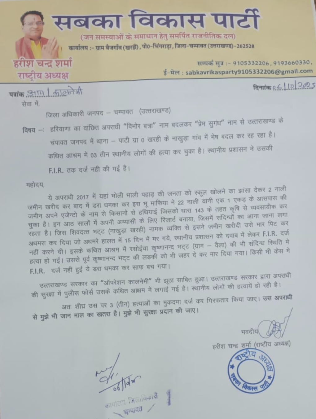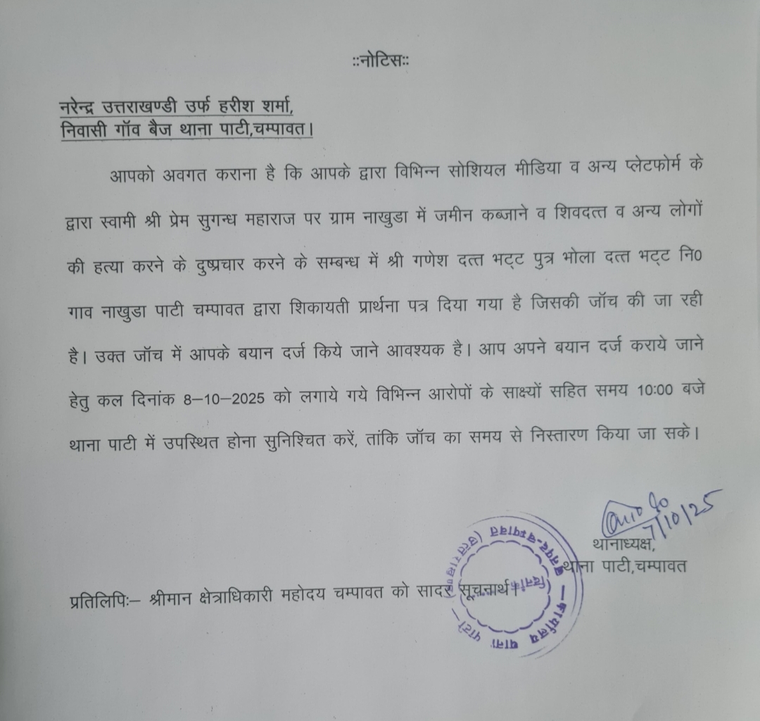 (साजिश या हकीकत)सबका विकास पार्टी के राष्ट्रीय अध्यक्ष हरिश्चंद्र शर्मा उर्फ नरेंद्र उत्तराखंडी निवासी बेज गांव(पाटी) के खिलाफ पाटी थाने में गणेश दत्त भट्ट पुत्र भोलानाथ भट्ट निवासी नाखुड़ा पाटी द्वारा एक शिकायती पत्र दिया गया है शिकायती पत्र में हरिश्चंद्र शर्मा उर्फ नरेंद्र उत्तराखंडी पर आरोप लगाए गए हैं कि विभिन्न सोशल मीडिया व अन्य प्लेटफार्म के द्वारा स्वामी प्रेम सुगंध महाराज पर ग्राम नाखुड़ा में जमीन कब्जाने व शिवदत्त व अन्य लोगों की हत्या करने का दुष्प्रचार किया गया है। मामले में पाटी पुलिस ने नरेंद्र उत्तराखंडी को 8 अक्टूबर 2025 को अपने बयान दर्ज करने तथा लगाए गए विभिन्न आरोपों के साक्ष्य सहित थाना पाटी में उपस्थित होने के निर्देश नोटिश के माध्यम से दिए हैं। मामले में हरिश्चंद्र शर्मा उर्फ नरेंद्र उतराखंडी ने पुलिस पर उन्हें अपनी शिकायत वापस लेने के लिए धमकाने के आरोप लगाए हैं।। हरिश्चंद्र शर्मा उर्फ नरेंद्र उत्तराखंडी ने 6 अक्टूबर 2025 को जिलाधिकारी को एक शिकायती पत्र दिया है शिकायती पत्र में उन्होंने महात्मा प्रेम सुगंध पर कई गंभीर आरोप लगाए ।आरोप में उन्होंने कहा है प्रेम सुगंध महाराज के द्वारा खरही के नाखुड़ा गांव में आश्रम में तीन स्थानीय लोगों की हत्या की गई है पुलिस के द्वारा मामले की एफआईआर तक दर्ज नहीं की गई है।