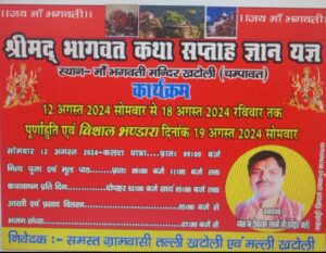 वहीं आयोजन समिति के द्वारा बताया गया 19 अगस्त को हवन यज्ञ व विशाल भंडारे के साथ कथा का समापन किया जाएगा आयोजन समिति व ग्रामीणों के द्वारा समस्त क्षेत्र वासियों से अधिक से अधिक संख्या में आकर भागवत कथा को सफल बनाने की अपील की है हाय जान को सफल बनाने के लिए क्षेत्रवासी जुटे पड़े हैं