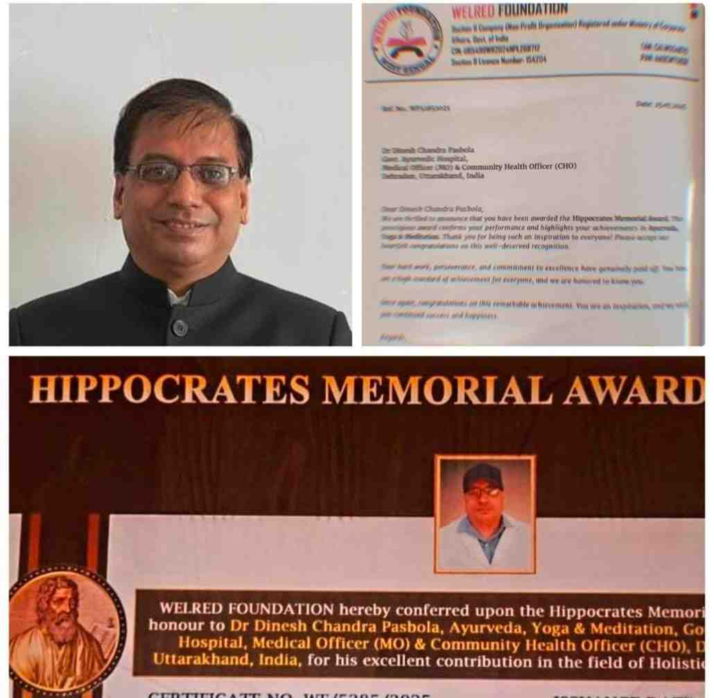 देहरादून में आज 18 जनवरी, रविवार को WELRED FOUNDATION, मेदिनीपुर, प० बंगाल द्वारा डॉ० प्रो० डी० सी० पसबोला को HIPPOCRATES MEMORIAL AWARD 2025 प्रदान किया गया है। जिसके डाइरेक्टर रासबिहारी कायेत और श्रावड़ी कायेत हैं।यह सम्मान प्रतिवर्ष आयुष चिकित्सा के क्षेत्र में उत्कृष्ट कार्य करने वाले आयुष चिकित्सकों को प्रदान किया जाता है।डॉ० पसबोला आयुर्वेद, होम्योपैथी, योग एवं ध्यान में उपाधि प्राप्त हैं तथा उनके द्वारा आयुष एवं आयुष चिकित्सा के क्षेत्र में किए गए उल्लेखनीय कार्यों एवं उपलब्धियों के लिए उन्हें यह प्रतिष्ठित सम्मान प्रदान किया गया है। इसके साथ ही डॉ० पसबोला एक उत्कृष्ट एनसीडी रिवर्सल एक्सपर्ट भी हैं तथा उत्तराखंड राज्य के आयुष विभाग में चिकित्सा अधिकारी के पद कार्यरत हैं एवं उन्हें 22 वर्षों के चिकित्साभ्यास का अनुभव प्राप्त है।डॉ० पसबोला को इस उपलब्धि पर सभी परिजनों, सहकर्मियों एवं शुभचिंतकों द्वारा शुभकामनाएं प्रदान की जा रही हैं।