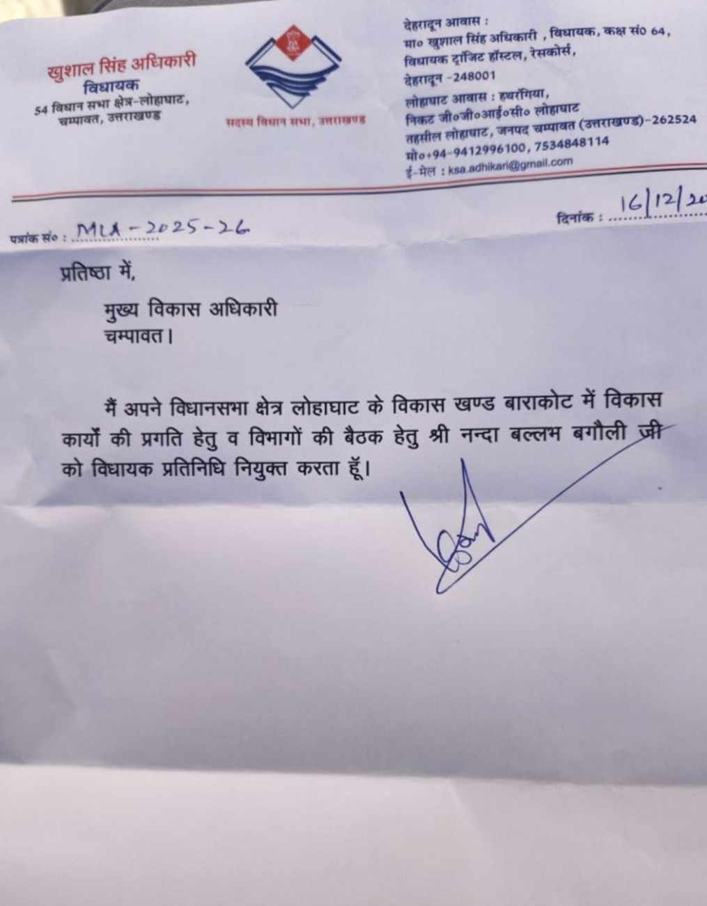 नंदा बल्लभ बगौली बने बाराकोट ब्लॉक के विधायक प्रतिनिधि।