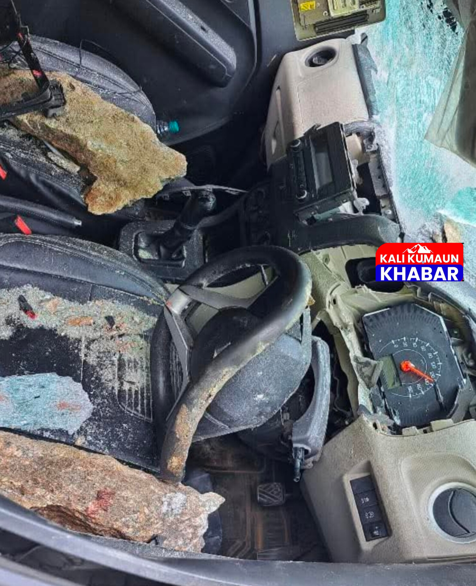 कार में सवार थे पांच लोगटनकपुर पिथौरागढ़ ऑल वेदर सड़क में पहाड़ी से पत्थर गिरने का लगातार खतरा बना हुआ है ।आज 17 अगस्त को पुलिस चौकी घाट (पिथौरागढ़) से आगे ऑल वेदर सड़क में अचानक पहाड़ी से पत्थर गिरने से एक कार बुरी तरह क्षतिग्रस्त हो गई। कार में चालक सहित कुल 05 लोग सवार थे। घटना में सभी लोग बाल बाल बच गए।सूचना पर घाट चौकी पुलिस मौके पर पहुँची और कार में फँसे सभी यात्रियों को सुरक्षित बाहर निकालकर उनके गंतव्य की ओर रवाना किया। पिथौरागढ़ पुलिस ने जनता से अपील करते हुए कहा वर्षा काल में पहाड़ी मार्गों पर भूस्खलन एवं पत्थर गिरने की घटनाएँ सामान्य होती हैं। अनावश्यक यात्रा से बचें तथा यात्रा से पूर्व मार्ग की स्थिति अवश्य जांच लें।