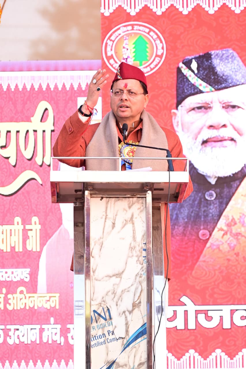 सड़कों की लंबाई दोगुनी हुई है और राज्य में 10 सरकारी और निजी मेडिकल कॉलेज संचालित हो रहे हैं। उन्होंने कहा कि प्रदेश में 42,000 से अधिक सोलर रूफटॉप संयंत्र लगाकर हमने वर्ष 2027 का लक्ष्य 2025 में ही हासिल कर लिया। उन्होंने कहा कि पहले योजनाओं की धनराशि में भी बंदरबांट हुआ करती थी और लाभार्थियों को कार्यालयों के चक्कर काटने पड़ते थे। लेकिन, आज डीबीटी के माध्यम से शत-प्रतिशत धनराशि खातों में स्थांतरित की जा रही है। इसी का परिणाम है कि नंदा गौरा योजना के तहत प्रदेश की 40 हजार से अधिक बेटियों को 172 करोड़ रुपए से अधिक की सहायता सीधे खाते में दी गई।मुख्यमंत्री ने मातृशक्ति को विशेष रूप से सम्बोधित करते हुए कहा कि उत्तराखंड की संस्कृति की असली वाहक आप हैं। आपके संस्कार, आपकी मेहनत और आपका त्याग ही हमारे समाज की सबसे बड़ी ताकत है। इसलिए महिला सशक्तिकरण हमारे लिए केवल नारा नहीं, बल्कि संकल्प है। उन्होंने कहा कि जो लोग दशकों तक सिर्फ वादे करते रहे, वे आज हमारी उपलब्धियों से घबराए हुए हैं, लेकिन मैं, आज इस मंच के माध्यम से ये स्पष्ट कर देना चाहता हूं कि "ये देवभूमि है, यहां विकास भी होगा, हमारी संस्कृति भी बचेगी और राष्ट्रविरोधी लोगों को यहां से अंतोतगत्वा जाना ही पड़ेगा"। हमारा लक्ष्य उत्तराखंड को देश का सर्वश्रेष्ठ राज्य बनाना है। और ये लक्ष्य कोई नारा नहीं, बल्कि हमारा "विकल्प रहित संकल्प" है और मुझे पूर्ण विश्वास है कि हमारे इस संकल्प को सिद्धि तक पहुंचाने के लिए आप सभी इसी प्रकार हमारी सरकार का सहयोग करते रहेंगे।