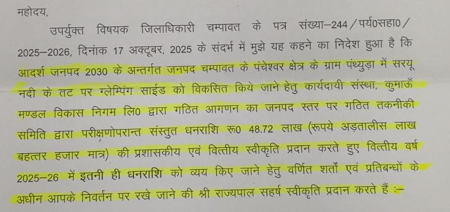 मुख्यमंत्री पुष्कर सिंह धामी के नेतृत्व में “आदर्श जनपद 2030” योजना के अंतर्गत चम्पावत जिले में पर्यटन विकास को सुदृढ़ करने हेतु एक महत्वपूर्ण कदम उठाते हुए पंचेश्वर क्षेत्र के ग्राम पंथ्युड़ा में सरयू नदी तट पर आधुनिक एवं लग्जरी ग्लैम्पिंग साइट विकसित करने की महत्वाकांक्षी परियोजना को शासन से औपचारिक स्वीकृति प्राप्त हो गई है।पर्यटन अनुभाग द्वारा कार्यदायी संस्था कुमाऊँ मण्डल विकास निगम (KMVN) द्वारा तैयार किए गए आगणन के आधार पर ₹48.72 लाख (अड़तालीस लाख बहत्तर हजार) की प्रशासकीय एवं वित्तीय स्वीकृति प्रदान की गई है। यह निर्णय पंचेश्वर जैसे दूरस्थ, प्राकृतिक संपदा से समृद्ध और सामरिक दृष्टि से महत्वपूर्ण क्षेत्र में पर्यटन को नई धार देने और स्थानीय अर्थव्यवस्था को सशक्त करने में सहायक सिद्ध होगा।प्रस्तावित ग्लैम्पिंग साइट में पर्यटकों के लिए प्राकृतिक वातावरण के बीच उच्च स्तरीय आवास, सरयू नदी के तट का आकर्षक दृश्य, शांत, स्वच्छ और पर्यावरणीय रूप से अनुकूल परिवेश तथा साहसिक गतिविधियों (एडवेंचर टूरिज्म) का विशेष अनुभव उपलब्ध कराया जाएगा।इस परियोजना से स्थानीय युवाओं के लिए रोजगार के नए अवसर, क्षेत्र में आर्थिक गतिविधियों का विस्तार, तथा चम्पावत को सस्टेनेबल टूरिज्म के उभरते मॉडल के रूप में स्थापित करने को मजबूती मिलेगी।