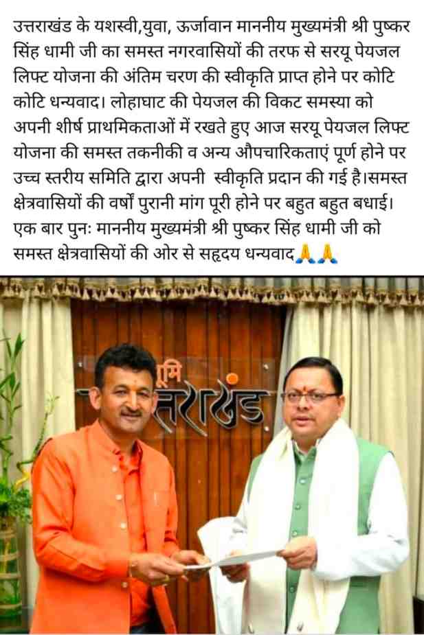लोहाघाट नगर वासियों की बरसों पुरानी सरयू लिफ्ट पेयजल योजना की मांग पूरी होने जा रही है। जल्द सरकार लोहाघाट नगर वासियों को सरयू नदी का पानी तोहफे में देने जा रही है। लोहाघाट पालिका अध्यक्ष गोविंद वर्मा ने बताया सरयू लिफ्ट पेयजल योजना के अंतिम चरण की स्वीकृति प्राप्त हो चुकी है।उन्होंने कहा मुख्य सचिव के नेतृत्व में हुई बैठक में योजना को स्वीकृति मिल चुकी है। जल्द ही मुख्यमंत्री पुष्कर सिंह धामी के द्वारा प्रशासनिक व वित्तीय स्वीकृति दी जाएगी। उन्होंने कहा मुख्यमंत्री धामी ने जो लोहाघाट नगर की जनता से वादा किया था वह निभाया है। जिसके लिए वह समस्त नगर की जनता की ओर से मुख्यमंत्री धामी को धन्यवाद देते हैं। उन्होंने कहा जल्द योजना धरातल पर नजर आएगी।