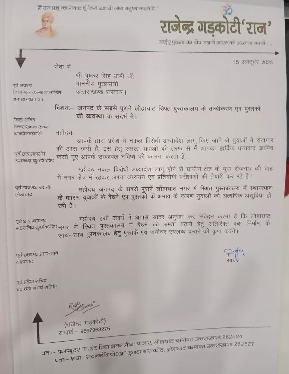 पुस्तकालय में बैठने की क्षमता बढ़ाने के साथ-साथ पुस्तकों की व्यवस्था किए जाने की मांगलोहाघाट। जनपद के सबसे पुराने पुस्तकालय लोहाघाट में अध्ययन हेतु बैठने की क्षमता बढ़ाने एवं पुस्तक उपलब्ध कराने का मांग पत्र मुख्यमंत्री को सोंपा।मुख्यमंत्री के चंपावत भ्रमण के दौरान राज्य आंदोलनकारी एवं सामाजिक कार्यकर्ता राजू गड़कोटी ने मुख्यमंत्री से मुलाकात कर जनपद के सबसे पुराने पुस्तकालय में प्रतियोगी परीक्षाओं की तैयारी कर रहे युवाओं के बैठने हेतु अतिरिक्त कक्ष एवं नए पाठ्यक्रम की पुस्तक उपलब्ध कराने का मांग पत्र सोंपा है। गरकोटी ने अपने मांग पत्र में बताया है कि प्रदेश में नकल विरोधी अध्यादेश लागू होने से आज अनेक होनहारों में रोजगार के प्रति आस जगी है इसी को लेकर ग्रामीण क्षेत्र के अनेक युवा नगर क्षेत्र में प्रतियोगी परीक्षाओं की तैयारी हेतु रह कर पुस्तकालय के माध्यम से तैयारी कर रहे हैं। गड़कोटी ने इस संदर्भ में मुख्यमंत्री से निवेदन किया है कि बैठने हेतु कक्ष उपलब्ध न होने एवं नए पाठ्यक्रम की पुस्तकें ना होने से युवाओं को अतिरिक्त आर्थिक बोझ उठाना पड़ रहा है इसलिए हेतु श्री गड़कोटी ने मुख्यमंत्री को अनुरोध पत्र देते हुए निवेदन किया है कि लोहाघाट पुस्तकालय में अतिरिक्त कक्ष का निर्माण कर युवाओं को प्रतियोगी परीक्षाओं के अनुरूप नये पाठ्यक्रम की पुस्तक उपलब्ध कराई जाए। गड़कोटी ने बताया कि मुख्यमंत्री द्वारा इस पर सकारात्मक पहल का आश्वासन उन्हें दिया है।ज्ञात हो राजू गड़कोटी छात्र जीवन से ही युवाओं के हितों की रक्षा करने एवं उनको सही दिशा और दशा देने के लिए निरंतर कार्य करते आ रहे हैं।