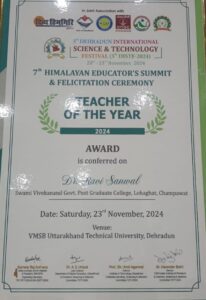उच्च शिक्षा के क्षेत्र मे उल्लेखनीय कार्य करने के लिए स्वामी विवेकानंद राजकीय स्नातकोत्तर महाविद्यालय लोहाघाट में वाणिज्य विभाग में कार्यरत्त असिस्टेंट प्रोफेसर डॉ. रवि सनवाल को वर्ष 2024 के टीचर ऑफ़ द ईयर अवार्ड से सम्मानित किया गया | डॉ. रवि सनवाल को यह पुरस्कार डी.जी.पी. उत्तराखंड अभिनव कुमार के द्वारा उत्तराखंड टेक्निकल यूनिवर्सिटी में आयोजित सम्मान समारोह मे दिया गया दिया |