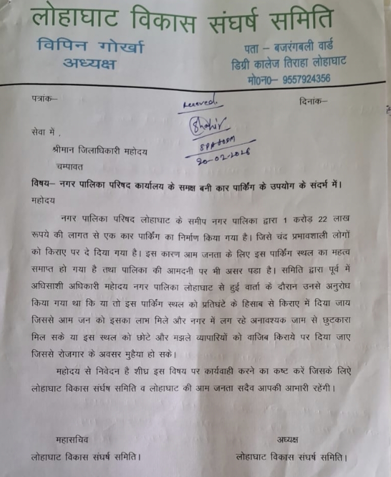 गोरखा ने बताया इसके अलावा नगर पालिका परिषद लोहाघाट के द्वारा पालिका कार्यालय के पास एक करोड़ 22 लाख रुपए की लागत से कार पार्किंग का निर्माण किया गया है जिसे चंद् प्रभावशाली लोगों को किराए पर दे दिया गया है आम जनता का इससे कोई फायदा नहीं हो रहा है। उन्होंने जिलाधिकारी से इस पार्किंग स्थल को प्रति घंटे के हिसाब से किराए में देने की मांग की गई ताकि आम जन को इसका लाभ मिल सके। या पार्किंग स्थल को छोटे व्यापारियों को वाजिब किराए पर दिया जाए जिससे रोजगार के अवसर भी मुहैया हो।