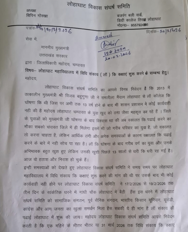 गोरखा ने बताया जिलाधिकारी ने सभी मांगों को गंभीरता से सुना तथा उन पर ठोस कार्रवाई का आश्वासन दिया है। लोहाघाट विकास संघर्ष समिति ने मुख्यमंत्री से छात्र हित को देखते हुए जल्द से जल्द लोहाघाट में लॉ की कक्षाएं संचालित करने की मांग की है।ज्ञापन देने में प्रहलाद सिंह मेहता पूर्व सभासद दीपक शाह, समिति उपाध्यक्ष राज किशोर शाह, भुवन बिष्ट, अजय गोरखा ,लोकेश पांडे आदि मौजूद रहे।
