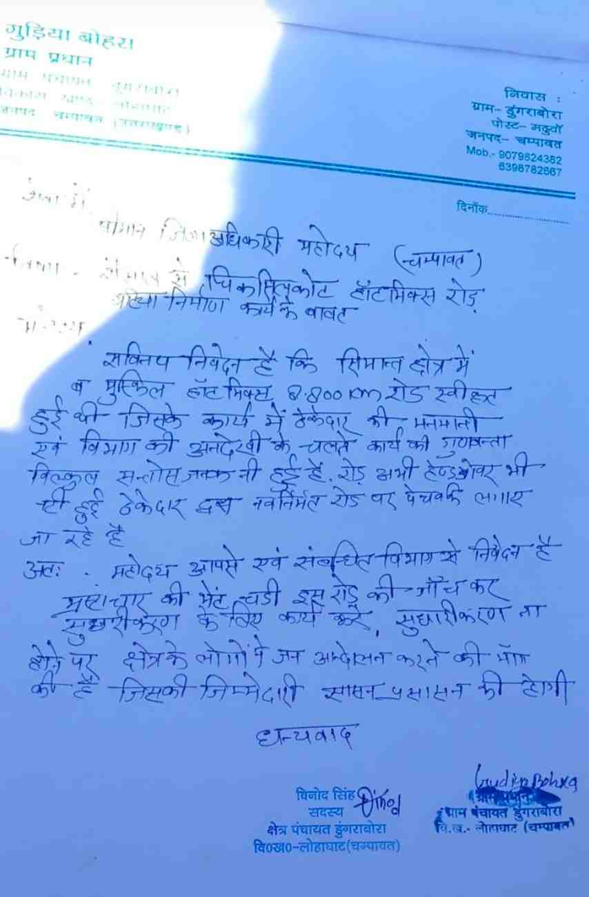 चंपावत जिले के लोहाघाट ब्लॉक की सीमांत सड़क में हुए डामरीकरण की गुणवत्ता पर सवाल खड़े हो गए है। यूकेडी के केंद्रीय मंत्री राजेंद्र पुनेठा उर्फ राजू भैया , क्षेत्र पचायत सदस्य बिनोद सिंह व ग्राम प्रधान ने इस सड़क की गुणवत्ता पर सवाल खड़े किए हैं।उन्होंने बताया पीएमजीएसवाई विभाग के द्वारा 688 लाख रुपए की लागत से 8.800 किलोमीटर रोसाल से डुगरा बोरा चकसिकोट सड़क का निर्माण कार्य करवाया है। रोड अभी हैंड ओवर तक नहीं हुई है पर सड़क का डामरीकरण उखड़ने लगा है । उन्होंने कहा विभाग व ठेकेदार अपनी इन कमियों को छुपाने के लिए जगह-जगह पैच वर्क करने में जुटे है। पुनेठा ने कहा सड़क की गुणवत्ता खराब होने से ग्रामीणों में भी गहरी नाराजगी है उन्होंने कहा संबंधित विभाग के अभियंता से उनकी बात हुई तो उनके द्वारा जांच की बात कहीं जा रही है। कहा सीमांत व दूरस्थ ग्रामीण क्षेत्र की जिन सड़कों पर भी कार्य हो रहा है उनकी गुणवत्ता काफी निम्न स्तर की पाई जा रही है।