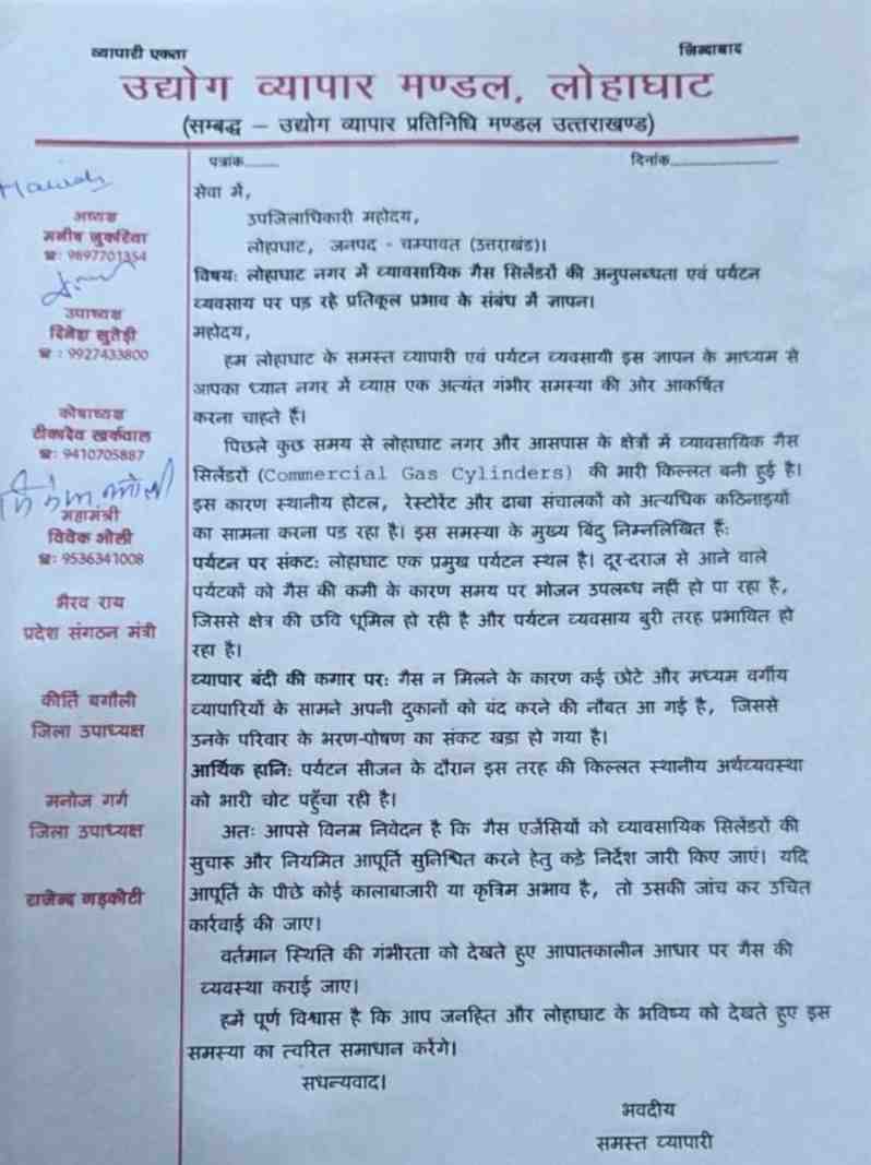 व्यापार मंडल अध्यक्ष ने एसडीएम से मांग करते हुए कहा कि गैस एजेंसी को व्यावसायिक सिलेंडरों की सुचारू और नियमित आपूर्ति सुचारू करने हेतु कड़े निर्देश जारी किए जाएं। यदि आपूर्ति के पीछे कोई कालाबाजारी या कृत्रिम अभाव है तो उसकी जांच कर उचित कार्रवाई की जाए। उन्होंने मांग करते हुए कहा वर्तमान स्थिति की गंभीरता को देखते हुए आपातकालीन आधार पर गैस की व्यवस्था कराई जाए ताकि नगर का पर्यटन व्यापार प्रभावित न हो कहा सबसे ज्यादा समस्या छोटे व्यापारियों को हो रही है ज्ञापन देने में विवेक ओली , दानू सूतेड़ी आदि व्यापारी नेता मौजूद रहे।