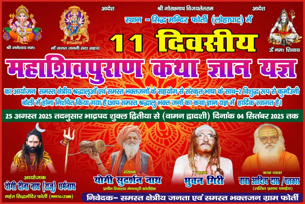 कुमाऊनी और संस्कृत भाषा में सुनाई जाएगी शिव महिमा लोहाघाट नगर की समीप वर्ती ग्राम सभा फोर्ति के सिद्ध मंदिर में आज सोमवार को क्षेत्र की मातृशक्ति व भक्तों के द्वारा निकाली गई भव्य कलश यात्रा के साथ 11 दिनी महाशिवपुराण कथा ज्ञान यज्ञ का शुभारंभ हो गया है। महाशिवपुराण कथा ज्ञान यज्ञ का आयोजन योगी दीनानाथ धर्मनाथ महंत सिद्ध मंदिर फोर्ती के द्वारा समस्त क्षेत्रीय श्रद्धालुओं एवं समस्त भक्तजनों के सहयोग से किया जा रहा है। कथा व्यास बाबा आदित्य दास(ललित प्रसाद पांडे)के द्वारा संस्कृत भाषा के साथ-साथ विशुद्ध रूप से कुमाऊनी भाषा में श्रद्धालुओं को सुनाई जाएगी। आज प्रातः मुख्य यजमान कैलाश पुनेठा के द्वारा सपत्नीक पूजा अर्चना संपन्न की गई। इसके बाद भव्य कलश यात्रा का आयोजन किया गया।