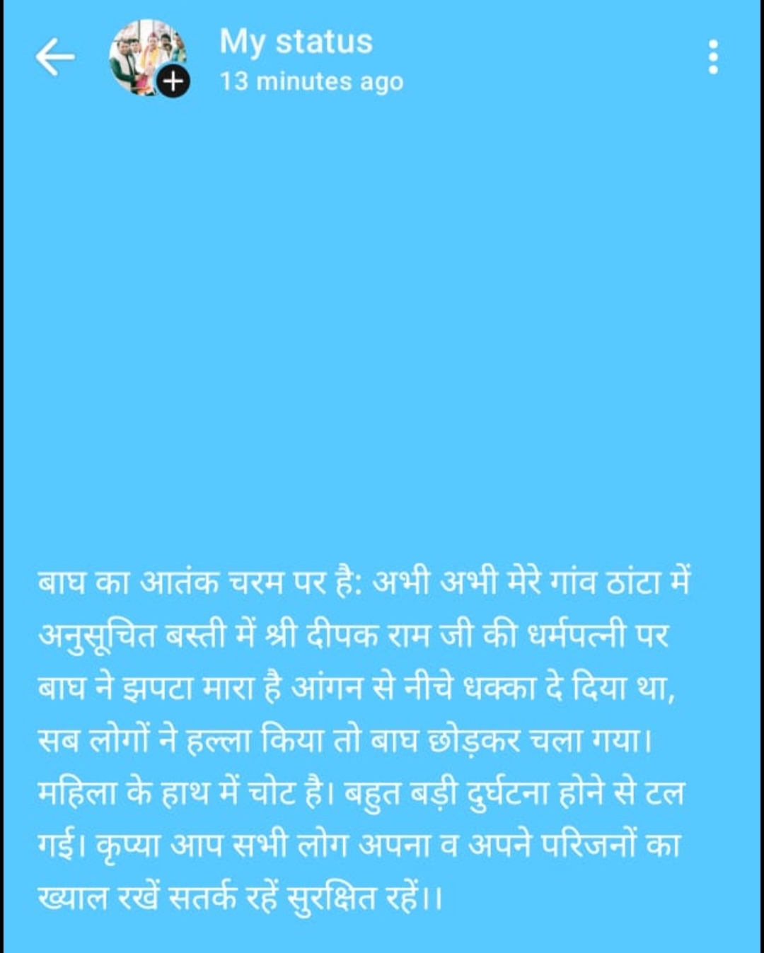 उन्होंने कहा गुलदार का भय पूरे क्षेत्र में फैल चुका है ।उन्होंने शासन प्रशासन व बन विभाग से जनता को गुलदारों के आतंक से निजात दिलाने के लिए ठोस पहल करने की मांग की है। कहा आज लोग अपने बच्चों को स्कूल भेजने में भी डर रहे हैं महिलाओं का जानवरों के लिए चारा पत्ती लाना तक बंद हो चुका है शाम होते ही गांव में कर्फ्यू सा माहौल हो चुका है। कहा प्रशासन को लोगों को जंगली जानवरों के आतंक से निजात दिलाने के लिए ठोस कदम उठाने पड़ेगे। कहा गनीमत रही गुलदार के हमले में महिला की जान बाल बाल बच गई अन्यथा आज एक बड़ा हादसा हो सकता था। उन्होंने ग्रामीणों से सतर्कता बरतने की अपील की है।वहीं घटना से पूरे गांव में दहशत फैल गई है।