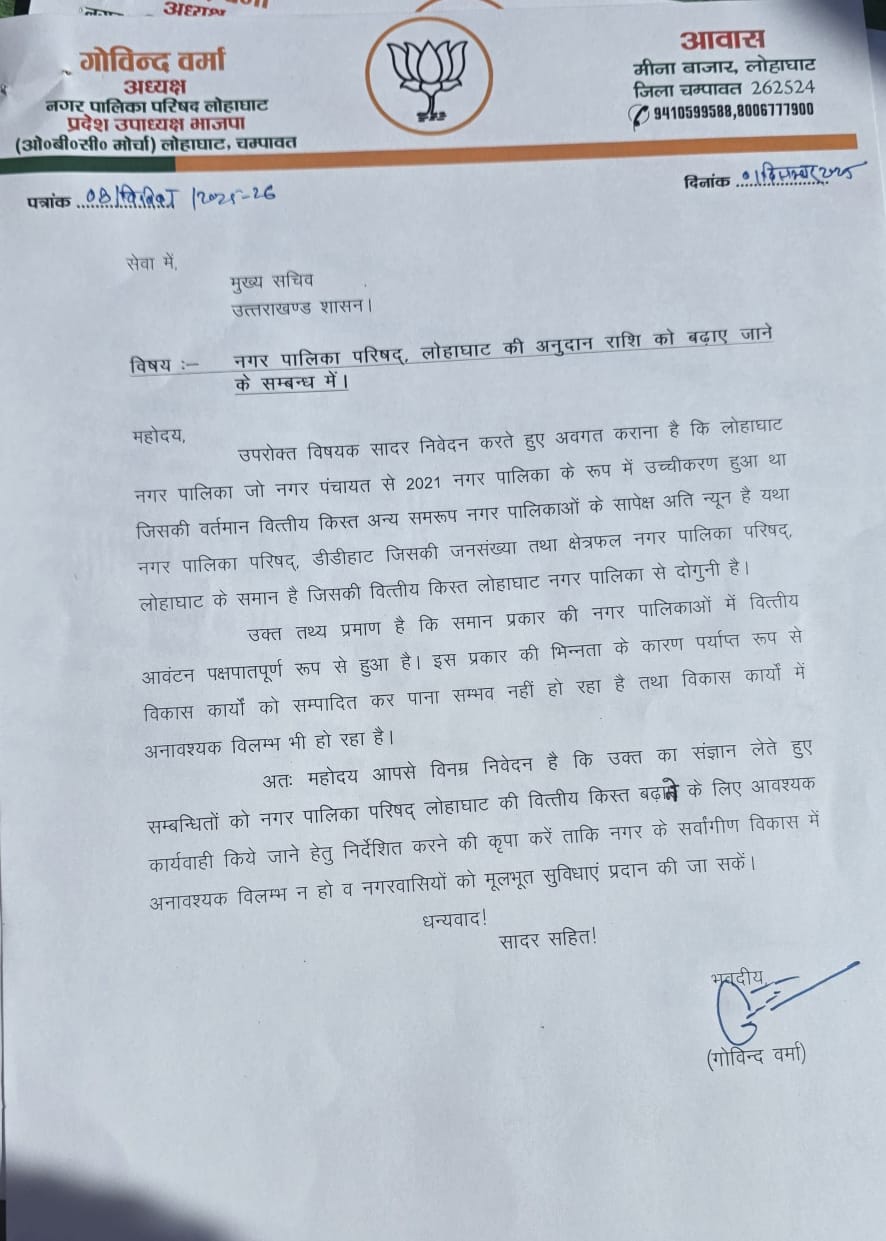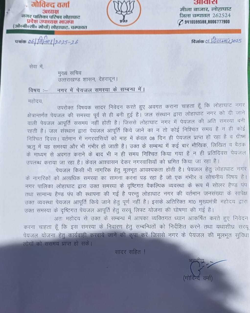 पालिका अध्यक्ष लोहाघाट गोविंद बर्मा ने नगर की विभिन्न समस्याओं को लेकर मुख्य सचिव को दिया ज्ञापन।