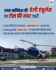 एम्स ऋषिकेश की हेली एंबुलेंस का टोल फ्री 1800 1804278 नंबर हुआ जारी