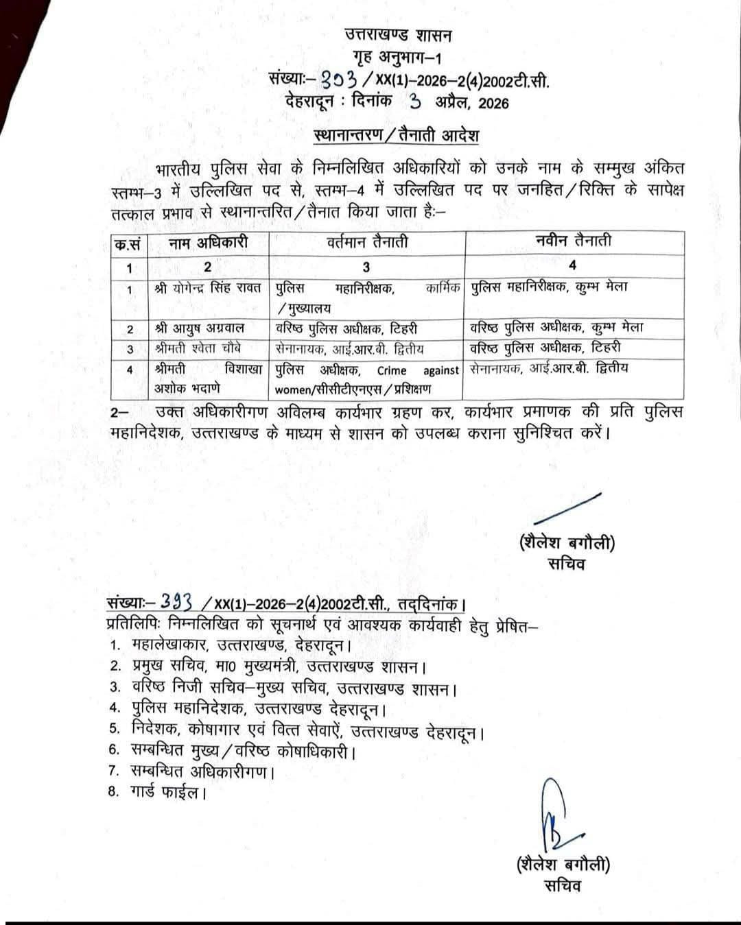 उत्तराखंड:आईपीएस अधिकारियों के तबादले श्वेता चौबे बनी एसएसपी टिहरी