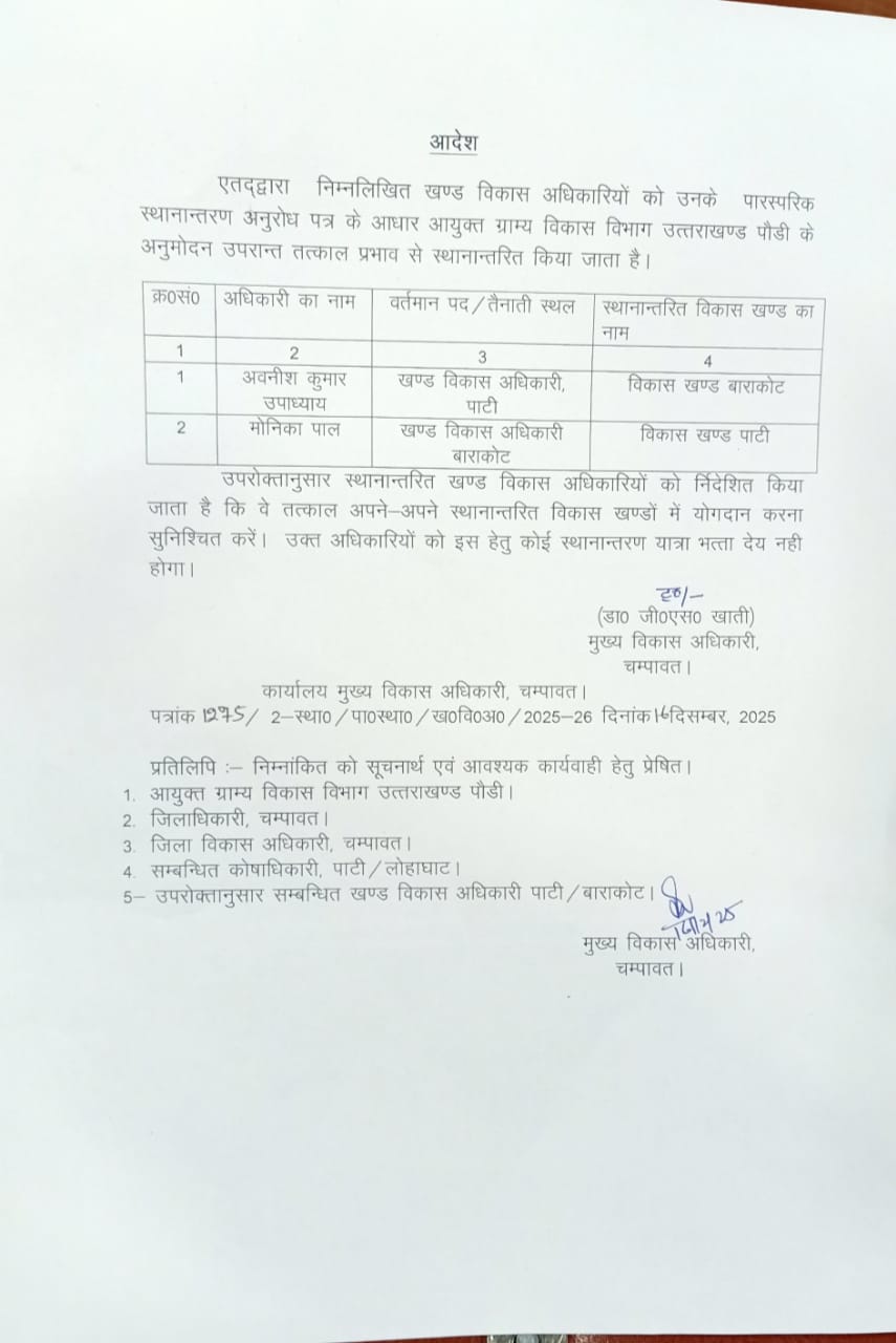 मुख्य विकास अधिकारी चंपावत डॉ0जी0 एस0 खाती ने जिले के दो खंड विकास अधिकारियों को इधर से उधर कर दिया है। जिसमें बाराकोट ब्लॉक की खंड विकास अधिकारी मोनिका पाल को वीडीओ पाटी बनाया गया है और वीडीओ पाटी अवनीश कुमार उपाध्याय को बाराकोट ब्लॉक की जिम्मेदारी सौंपी गई है। मुख्य विकास अधिकारी ने तत्काल नई जिम्मेदारी संभालने के निर्देश दिए हैं।