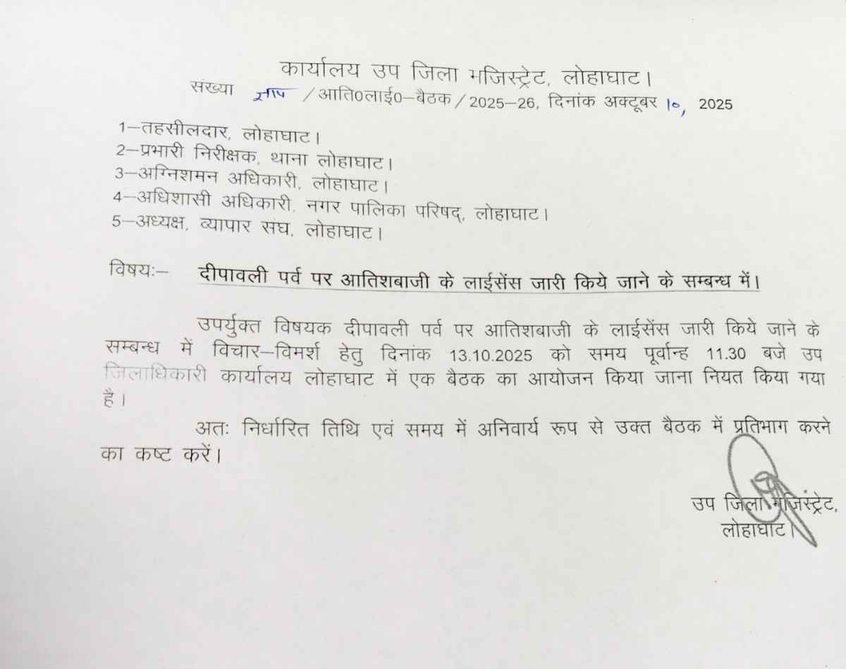 रिपोर्ट:लक्ष्मण बिष्ट : लोहाघाट :दीपावली पर्व पर आतिशबाजी के लाइसेंस जारी करने हेतु 13 अक्टूबर को व्यापारियों व प्रशासन के बीच महत्वपूर्णबैठक।