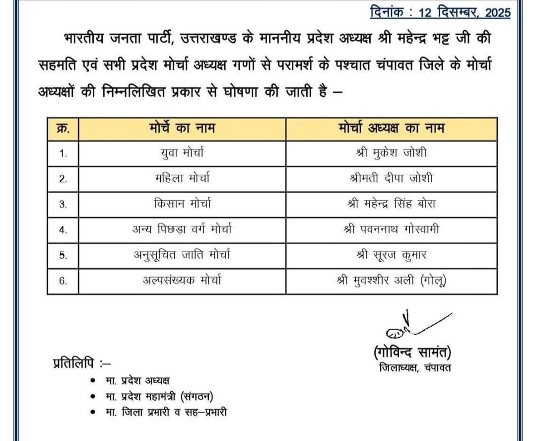 रिपोर्ट:लक्ष्मण बिष्ट : चंपावत भाजपा युवा मोर्चा के जिला अध्यक्ष बने मुकेश जोशी।