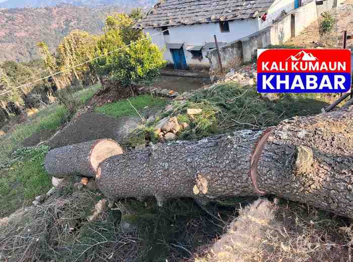रिपोर्ट:लक्ष्मण बिष्ट : चंपावत:जीआईसी गुंठ गरसाडी परिसर में कटा देवदार का पेड़।