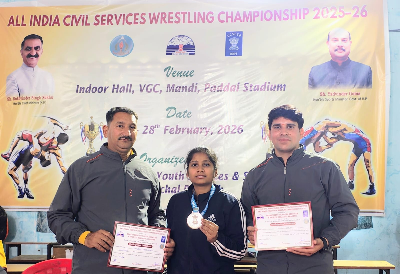 हिमाचल प्रदेश में आयोजित अखिल भारतीय सिविल सर्विसेज कुश्ती प्रतियोगिता में उत्तराखण्ड राज्य के खिलाड़ियों ने शानदार प्रदर्शन कर प्रदेश का नाम रोशन किया है।टिहरी के युवा कल्याण विभाग में कार्यरत ज्योति ने 62 किग्रा फ्री स्टाइल वर्ग में रजत पदक प्राप्त किया।तथा पिनानातलाडी रीठासाहिब के पी.एम.श्री. अटल उत्कृष्ट राईका खटीमा में कार्यरत प्रशासकीय अधिकारी श्री भैरव दत्त भट्ट ने 92 किग्रा फ्री स्टाइल वर्ग में तथा अल्मोड़ा के मयंक शर्मा ने 92 किग्रा फ्री स्टाइल वर्ग में प्रथम बार राष्ट्रीय स्तर के क्वार्टर फाइनल में प्रतिभाग कर शानदार प्रदर्शन किया। इस प्रकार राष्ट्रीय स्तर पर खिलाड़ियों ने उत्कृष्ट प्रदर्शन कर प्रदेश का नाम रोशन किया। खिलाड़ियों की इस उपलब्धि पर अधिकारियों एवं जनप्रतिनिधियों द्वारा बधाई दी गई और उनके उज्ज्वल भविष्य की कामना की गई।