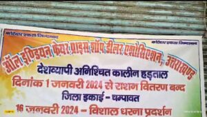 साथ ही कहा कि जब तक उनकी मांग पूरी नहीं की जाती है तब तक वह हड़ताल पर डटे रहेंगे। अध्यक्ष भरत राम ने बताया की आल इंडिया फेयर प्राइस ऑफ़ डीलरशिप फेडरेशन की जिला इकाई द्वारा राष्ट्रीय संगठन के आवाहन पर 1 जनवरी से अनिश्चितकालीन हड़ताल का ऐलान किया गया था। बताया की देश व्यापारी हड़ताल के चलते सस्ता गल्ला विक्रेताओं ने एकत्रित होकर समर्थन किया।