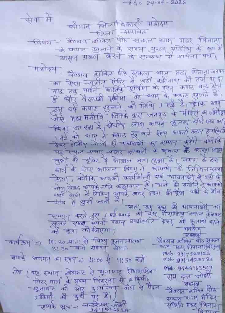शक्तिपीठ सकल धाम महर पिनाना के कपाट खुलते समय जिलाधिकारी को आमंत्रण