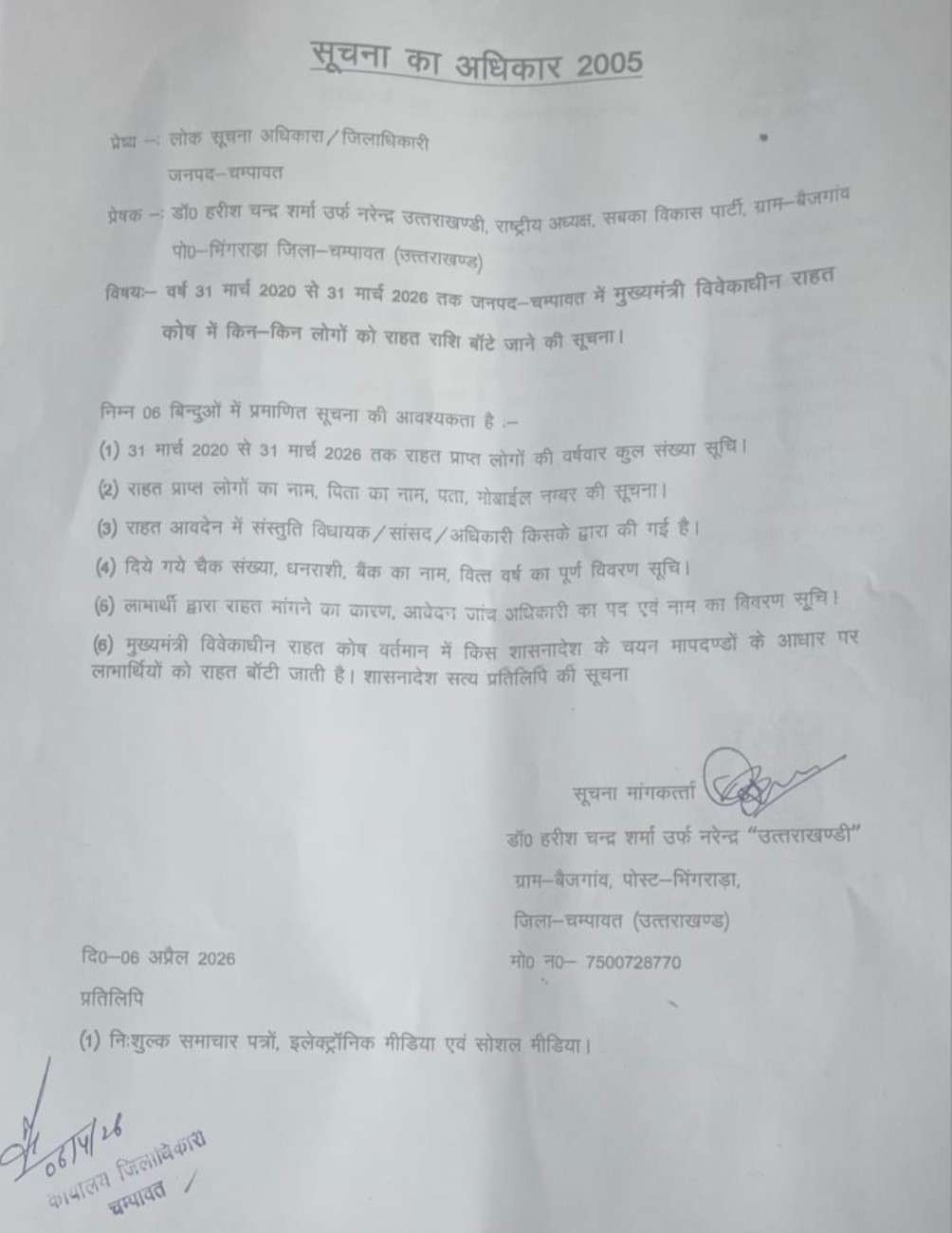 मुख्यमंत्री विवेकाधीन राहत कोष की बाट का विवाद अब चंपावत जिले में भी गर्माता जा रहा है। डॉक्टर हरिश्चंद्र शर्मा उर्फ नरेंद्र उत्तराखंडी राष्ट्रीय अध्यक्ष सबका विकास पार्टी ने 31 मार्च 2020 से 31 मार्च 2026 तक जनपद चंपावत में मुख्यमंत्री विवेकाधीन राहत कोस से लाभान्वित हुए लाभार्थियों की सूची सूचना के अधिकार के तहत लोक सूचना अधिकारी से मांगी गई है। उन्होंने 6 बिंदुओं पर सूचना मांगी है। जिनमे 31 मार्च 2020 से 31 मार्च 2026 तक राहत प्राप्त लोगों की वर्षवार कुल संख्या/राहत प्राप्त लोगों का नाम पिता का नाम पता मोबाइल नंबर की सूचना/राहत आवेदन में सस्तुति विधायक, सांसद व अधिकारी किसके द्वारा दी गई है/दिए गए चेक संख्या, धनराशि ,बैंक का नाम, वित्त वर्ष का पूर्ण विवरण/लाभार्थी द्वारा राहत मांगने का कारण आवेदन जांच अधिकारी का पद एवं नाम का विवरण/तथा मुख्यमंत्री विवेकाधीन राहत कोष वर्तमान में किस शासनादेश के चयन मापदंडों के आधार पर लाभार्थियों को राहत बाटी जा रही है व शासनादेश की सत्य प्रतिलिपि मांगी गई है।