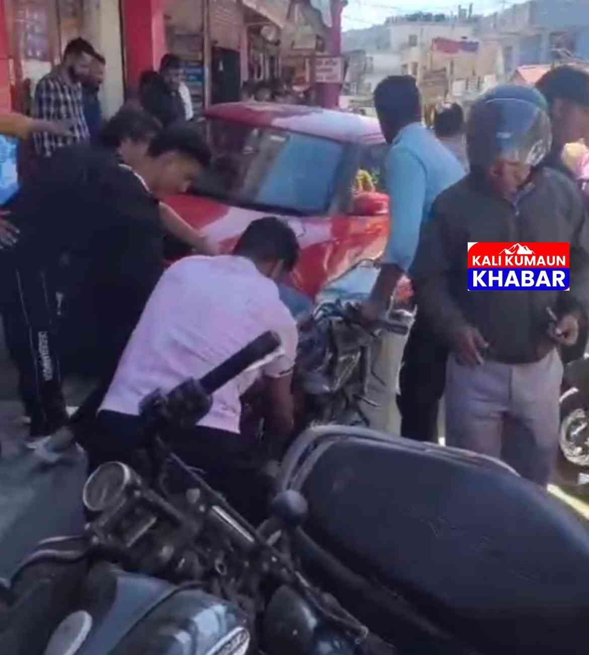 लोहाघाट में बेकाबू कार का कहर सड़क किनारे खड़ी बाईको को रोदा। लोगों ने भाग कर बचाई जान।