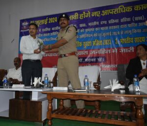 एसपी चंपावत अजय गणपतिके निर्देश तथा पुलिस उपाधीक्षक चम्पावत / टनकपुर के पर्यवेक्षण में आज दिनांक 01 जुलाई 2024 से सम्पूर्ण भारतवर्ष में लागू हो रहे नये भारतीय कानूनो के सम्बन्ध* में अधिक से अधिक लोगों को जागरूक किये जाने हेतु सभी थाना प्रभारियों को निर्देशित किया गया है ।उक्त के क्रम में आज दिनांक को जिला गोरलचौड़ चम्पावत सभागार* में भी नये कानूनों के सम्बन्ध में उद्बोधन तथा *जन जागरूकता* हेतु *सभागार गोरलचौड़ मैदान चम्पावत* में *उद्बबोधन तथा जनजारूकता कार्यक्रम* आयोजित किये गये ।उक्त गोष्ठी में नवनीत पाण्डेय, जिलाधिकारी द्वारा मुख्य अतिथि के रूप में प्रतिभाग किया गया, साथ ही 36वीं वाहिनी, आईटीबीपी लोहाघाट, पंचम वाहिनी एसएसबी चम्पावत के अधिकारी/कर्मचारीगणो, अभियोजन चम्पावत, जनप्रतिनिधियों, स्थानीय व्यापार मण्डल के पदाधिकारियो, टैक्सी यूनियन, स्थानीय गणमान्य व्यक्तियों, वन स्टाप सेन्टर के प्रतिनिधियों, प्रिन्ट एवं इलेक्ट्रानिक बन्धु, पुलिस विभाग तथा स्कूली छात्र-छात्राओं द्वारा प्रतिभाग किया गया ।