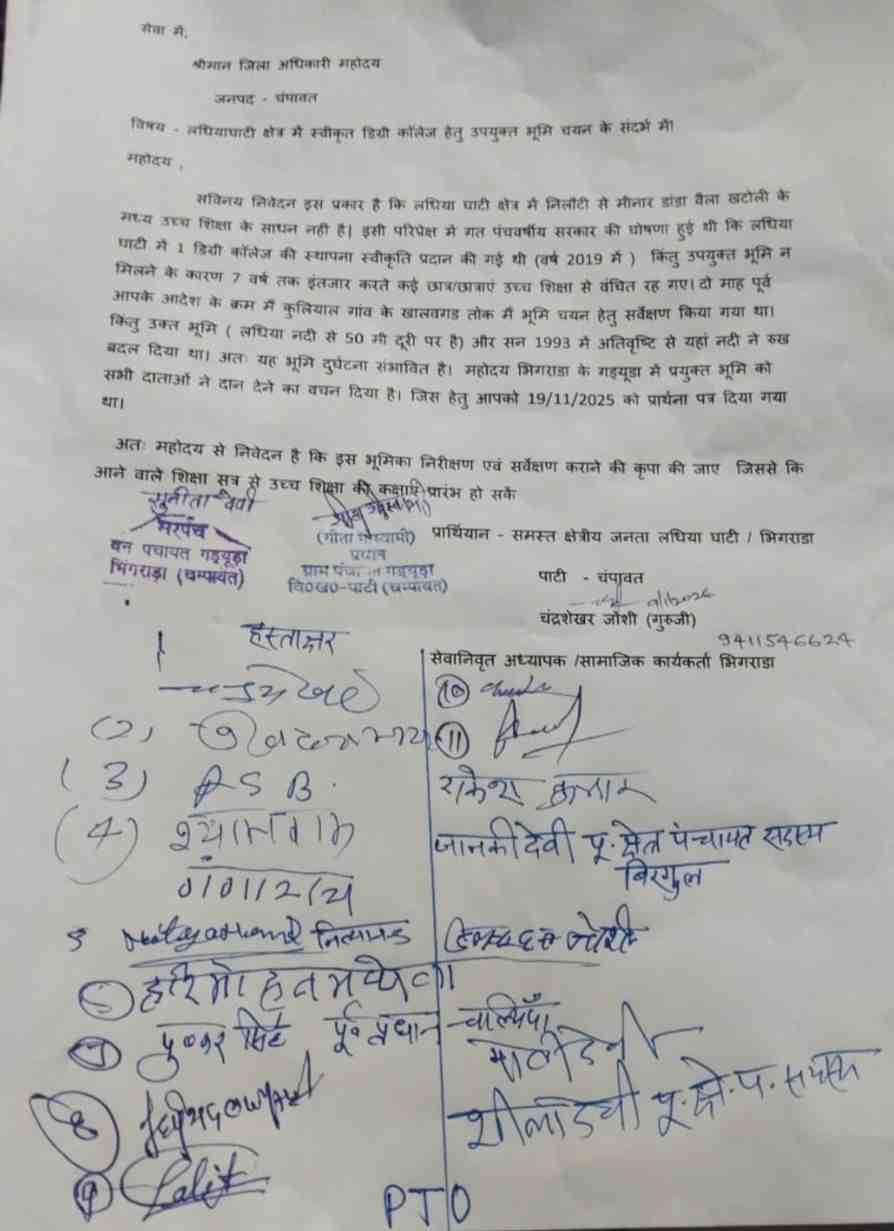 रिपोर्ट:दीपक शर्मा : चंपावत:लधीया घाटी क्षेत्र वासियों की डीएम से डिग्री कॉलेज भवन निर्माण के लिए भूमि सर्वेक्षण की मांग।