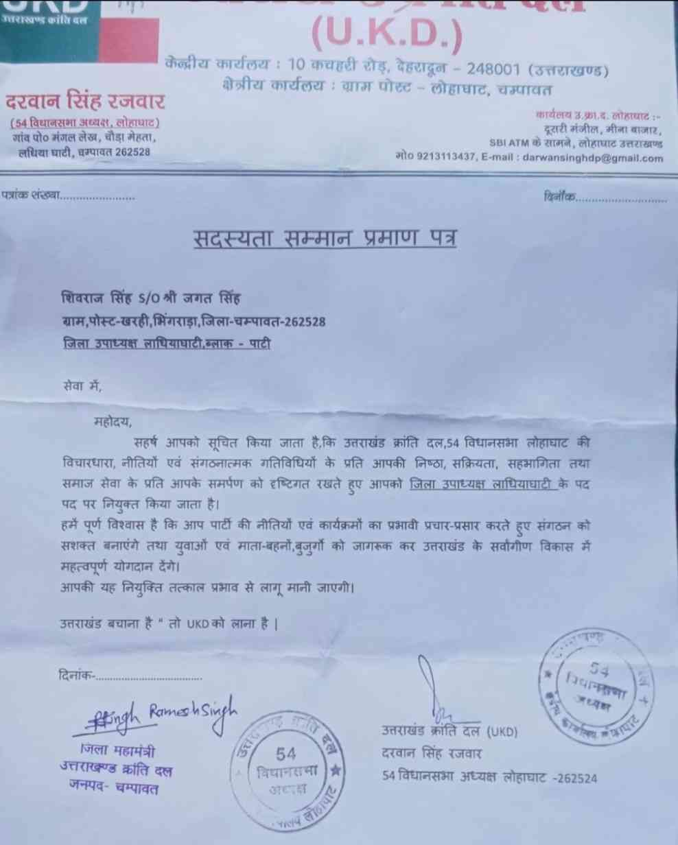रिपोर्ट: दीपक शर्मा : चंपावत:शिवराज सिंह बोहरा बने यूकेडी जिला उपाध्यक्ष पार्टी को मिली मजबूती
