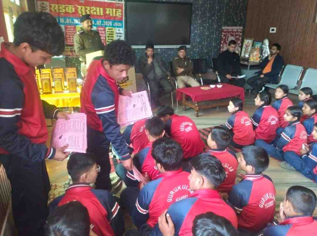 उत्तराखण्ड पुलिस द्वारा मनाए जा रहे 36वें सड़क सुरक्षा माह के समापन अवसर पर गुरुकुलम एकेडमी, खुना बोरा (लोहाघाट), जनपद चम्पावत में एक व्यापक जागरूकता कार्यक्रम एवं पेंटिंग प्रतियोगिता का आयोजन किया गया। शशांक पाण्डे एवं अंकित देव के संचालन में हुए कार्यक्रम में चम्पावत पुलिस यातायात निरीक्षक हयात सिंह एवं ज्योति प्रकाश के नेतृत्व में सफलतापूर्वक संपन्न हुआ। विद्यालय परिवार की सक्रिय सहभागिता से यह आयोजन प्रेरणादायक एवं प्रभावशाली रहा।कार्यक्रम का उद्देश्य नौनिहालों के माध्यम से समाज में सड़क सुरक्षा के प्रति जागरूकता का संदेश फैलाना था। इसी क्रम में आयोजित पेंटिंग प्रतियोगिता में विद्यालय के तीन अलग-अलग वर्गों के छात्र-छात्राओं ने उत्साहपूर्वक भाग लिया। बच्चों ने हेलमेट पहनने की अनिवार्यता, सीट बेल्ट का महत्व, ट्रैफिक सिग्नल का पालन, मोबाइल का प्रयोग करते हुए वाहन न चलाने, ओवरस्पीडिंग से बचने तथा सुरक्षित सड़क व्यवहार जैसे विषयों पर आकर्षक, रचनात्मक एवं संदेशपूर्ण चित्र बनाए। कई चित्रों में “सावधानी हटी, दुर्घटना घटी” जैसे प्रभावी संदेशों के माध्यम से जन-जागरूकता का सशक्त प्रयास दिखाई दिया।निर्णायक मंडल द्वारा प्रतिभागियों के चित्रों का मूल्यांकन कर उत्कृष्ट प्रदर्शन करने वाले विद्यार्थियों को प्रथम, द्वितीय एवं तृतीय पुरस्कार देकर सम्मानित किया गया। पुरस्कार पाकर बच्चों के चेहरे पर खुशी और आत्मविश्वास झलक रहा था। चम्पावत पुलिस अधिकारियों ने सभी प्रतिभागियों की सराहना करते हुए कहा कि ऐसे कार्यक्रमों से बच्चों में जिम्मेदारी की भावना विकसित होती है और वे समाज के सच्चे जागरूक नागरिक बनते हैं।इस अवसर पर यातायात पुलिस टीम ने विद्यार्थियों को सड़क पर चलते समय अपनाई जाने वाली सावधानियों, दोपहिया वाहन चलाते समय हेलमेट पहनने, चारपहिया वाहन में सीट बेल्ट लगाने, नाबालिगों द्वारा वाहन न चलाने तथा यातायात नियमों का पालन करने के महत्व के बारे में विस्तार से जानकारी दी। साथ ही “अच्छे राहगीर पुरस्कार योजना” के तहत दुर्घटना पीड़ितों की सहायता करने वालों को मिलने वाले प्रोत्साहन के बारे में बताया गया। रोड सेफ्टी उत्तराखण्ड पुलिस ऐप की जानकारी देते हुए छात्रों को तकनीक के माध्यम से भी सुरक्षित यातायात में सहयोग करने के लिए प्रेरित किया गया।कार्यक्रम के अंत में उपस्थित सभी विद्यार्थियों एवं शिक्षकों को यह संकल्प दिलाया गया कि वे स्वयं यातायात नियमों का पालन करेंगे तथा अपने परिवार और आसपास के लोगों को भी इसके लिए प्रेरित करेंगे।इस अवसर पर प्रबंधक राजेश पाण्डेय,प्रधानाचार्य भास्कर चौबे, कोऑर्डिनेटर कविता पुनेठा,मनमोहन गहतोड़ी,चंद्र भानु,मयंक मुर