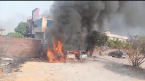 हल्द्वानी में KI A कार के गोदाम में लगी आग तीन कार जलकर हुई खाक