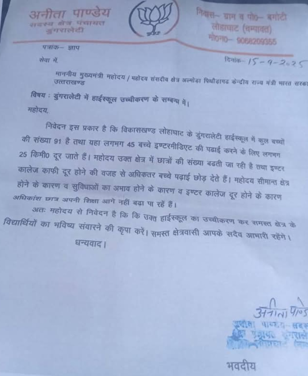 क्षेत्र पंचायत सदस्य अनीता पांडे ने डूंगरा लेटी हाई स्कूल के उच्चीकरण की मांग को लेकर मुख्यमंत्री को दिया ज्ञापन।