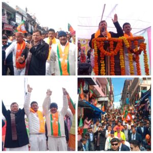 सीएम धामी ने कहा कि हमें पूरा विश्वास है कि इस बार लोहाघाट सहित पूरे प्रदेश की जनता डबल इंजन की सरकार को ट्रिपल इंजन की सरकार बनाएगी। सीएम धामी ने उपलब्धियां गिनाते हुए कहा कि समाज के प्रत्येक वर्ग के उत्थान हेतु हमारी सरकार संकल्पित होकर कार्य कर रही है। प्रधानमंत्री नरेन्द्र मोदी ने सबका साथ सबका विकास के सिद्धांत पर चलते हुए भारत को समृद्धि की उंचाईयों तक पहुंचाया है। उत्तराखण्ड सरकार भी प्रदेश को विकास की नई उंचाईयों तक ले जाने के लिए प्रयास कर रही है। सरकार योजनाओं को प्रभावी ढंग से लागू करने के लिए काम कर रही है। हर क्षेत्र में विकास की गंगा बहाई जा रही है। विभिन्न जन कल्याणकारी योजनाओं का लाभ प्रत्येक व्यक्ति को देने का प्रयास किया जा रहा है। सरकार की योजनाओं से आज प्रदेश में लोगों का जीवन स्तर सुधरा है। रोजगार के नये अवसर लगातार सृजित किये जा रहे हैं। युवाओं को रोजगार देने में हम अग्रणी राज्य के रूप में उभरे हैं। हमारी सरकार ने राज्य में अनेक ऐतिहासिक निर्णय लिये हैं, जिन्हें पूर्व की सरकारों ने ठण्डे बस्ते में डाल रखा था। इसी माह हम समान नागरिक संहिता को लागू करने जा रहे हैं उत्तराखंड इस मामले में देश का पहला राज्य बना है। हमारी प्राथमिकता केवल घोषणाएं करना नहीं बल्कि घोषणाओं को धरातल पर उतारना है। इसके लिए केन्द्र और प्रदेश में भाजपा की सरकार के बाद नगर निगमों और निकायों में भी भाजपा की सरकार बनना जरूरी है। इस बार के चुनाव में एक ओर भाजपा की सरकार है जो संकल्प को पूरा करती है और अपना रिपोर्ट कार्ड भी जनता के सामने रखती है, दूसरी ओर कांग्रेस है जो हमेशा कागजों पर योजनाएं बनाकर जनता की गाढ़ी कमाई से अपनी तिजोरियां भरने का काम करती आयी है। सीएम धामी ने कहा कि ट्रिपल इंजन की सरकार बनाओ में वादा करता हूं कि लोहाघाट के विकास में कोई कमी नहीं आने दूंगा सीएम धामी अपने रोड से लोहाघाट नगर की जनता में जोश भर गए लोहाघाट से मुख्यमंत्री चंपावत में जनसभा को संबोधित करने निकले वही केंद्रीय मंत्री अजय टम्टा ने भी जनसभा को संबोधित कर भाजपा प्रत्याशियों के पक्ष मे बोट मांगें। रोड शो में पूर्व भाजपा विधायक पूरन सिंह फर्त्याल,भाजपा जिला अध्यक्ष निर्मल मेहरा, मोहित पाठक सतीश पांडे ,सतीश खर्कवाल ,सचिन जोशी, राजू गढ़कोटी, दीपक जोशी ,दीपक जोशी ,राजेश बिष्ट, आनंद कोरंगा जिला पंचायत प्रशासक ज्योति राय ,विनीता फर्त्याल , जीवन गहतोड़ी ,योगेश मेहता, बलवंत गिरी, गिरीश कुवर, सुभाष बगोली , लता वर्मा चंद्रकला मेहरा ,निर्मला पांडे सहित कई भाजपा कार्यकर्ता मौजूद रहे