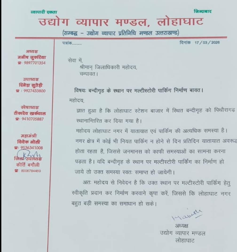 रिपोर्ट: लक्ष्मण बिष्ट : लोहाघाट:बंदी ग्रह की भूमि पर बने मल्टी स्टोरी पार्किंग व्यापार संघ अध्यक्ष की जिलाधिकारी से मांग।