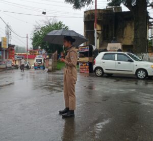 बुधवार को जहा भारी बारिश के चलते लोग घरों से बाहर नही निकल पा रहे हैं वही लोहाघाट में हो रही भारी बारिश के बीच लोहाघाट नगर के मीना बाजार चौराहा में एक महिला होमगार्ड अपनी ड्यूटी में डठी रही महिला होमगार्ड छाता लेकर यातायात नियंत्रित करती नजर आई वहीं लोगों के द्वारा इस महिला होमगार्ड की कर्तव्यनिष्ठा की सराहना की गई लोगों ने कहा इस महिला होमगार्ड से अन्य लोगों ने सीख लेनी चाहिए तथा मनोबल बढ़ाने के लिए सम्मानित करना चाहिए वहीं महिला होमगार्ड का कहना है वह सिर्फ अपनी ड्यूटी निभा रही है उन्हें विभाग के द्वारा हर मौसम में अपनी ड्यूटी निभाने की ट्रेनिंग दी गई है