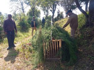 पिंजरा लगाने की मांग करते हुए लोहाघाट रेंजर दीप जोशी को ज्ञापन दिया मामले का तत्काल संज्ञान लेते हुए डीएफओ चंपावत आर0सी0कांडपाल के निर्देश और रेंजर लोहाघाट दीप जोशी के नेतृत्व में बन कर्मियों ने आज राईकोट क्षेत्र में पिंजरा लगा दिया है रेंजर जोशी ने कहा पिजड़ा लगाने के साथ-साथ आज से बनकर्मी रात मे गुलदार प्रभावित क्षेत्र में गस्त करेंगे उन्होंने ग्रामीणों से अकेले जंगलों में न जाने बच्चों को