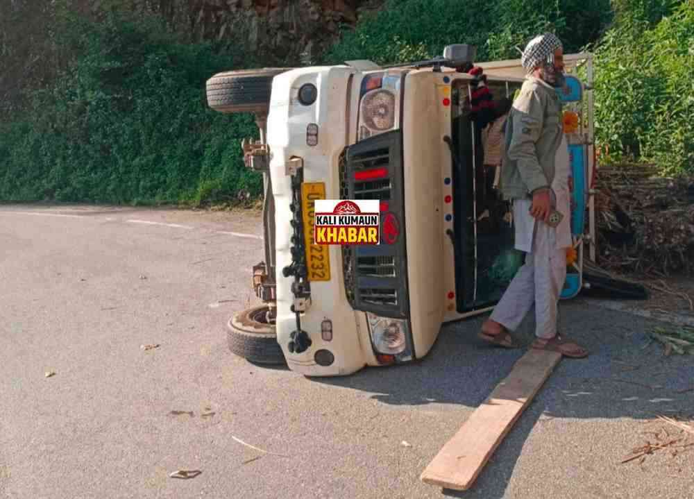 लोहाघाट पिथौरागढ़ राष्ट्रीय राजमार्ग में आज बुधवार सुबह भारतोली के पास एक बड़ा हादसा होने से बाल बाल बच गया। जानकारी के मुताबिक uk03ca 2232 नंबर की पिकअप टनकपुर से पिथौरागढ़ की ओर गन्ना भरकर जा रही थी।तभी भारतोली के पास एक मोड़ पर अचानक पिकअप अनियंत्रित होकर सड़क में पलट गई। पिकअप में चालक सहित दो लोग सवार थे। दुर्घटना में दोनों लोगों को मामूली चोट आई है। क्षेत्र के सामाजिक कार्यकर्ता दीपेंद्र अधिकारी ने बताया घटना आज सुबह 5:00 से 6:00 बजे के लगभग की है।कहा दुर्घटना में दोनों लोग सुरक्षित हैं उन्होंने बताया एक बड़ा हादसा होने से बाल बाल बच गया।
